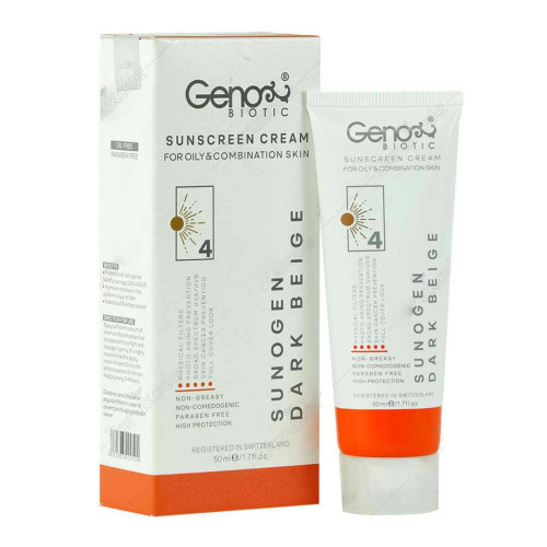 کرم ضد آفتاب ژنوبایوتیک مدل SPF 50 SunoGen4 مناسب پوست چرب حجم 50 میل بژ تیره، با دارا بودن فیلترهای UV و همچنین مواد موثره گیاهی، نقش موثری در مهار اثرات مضر پرتوهای UVA و UVB دارد. بافت این کرم برای پوست های چرب طراحی شده، که علاوه بر ایجاد پوشش کامل بر روی پوست، فاقد چربی بوده و با دارا بودن بافت سبک، مانع از انسداد پوستی و تشکیل آکنه میشود. عصاره گل مغربی موجود در آن از آفتاب سوختگی و التهاب و قرمزی ناشی از آن جلوگیری میکند. ویتامین E که به خاصیت آنتی اکسیدانیاش شهرت دارد باعث مهار رادیکال های آزاد میشود. عصاره آلوئه ورا نیز یک رطوبت رسانی قوی بوده و از پوست در برابر آفتاب سوختگی محافظت میکند.